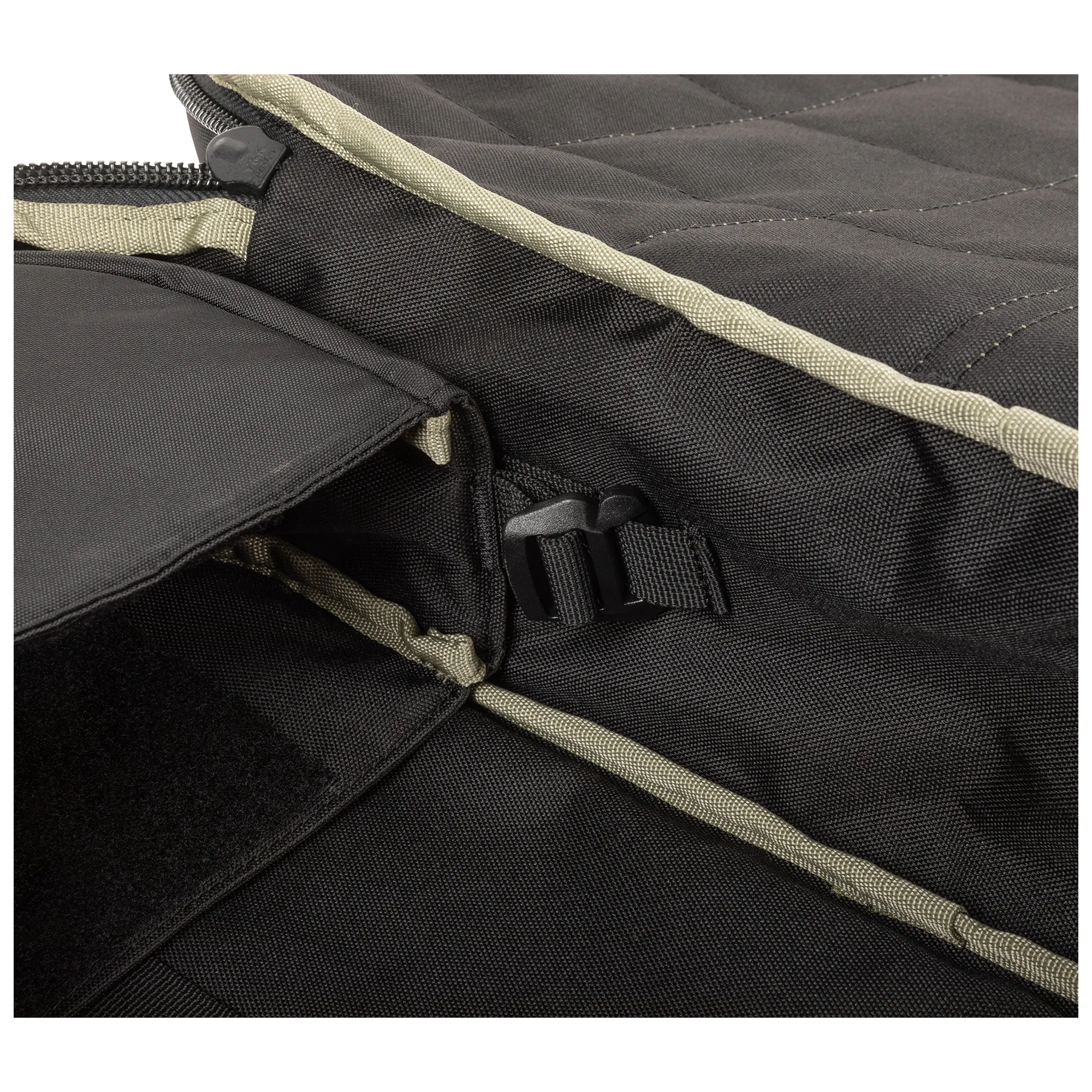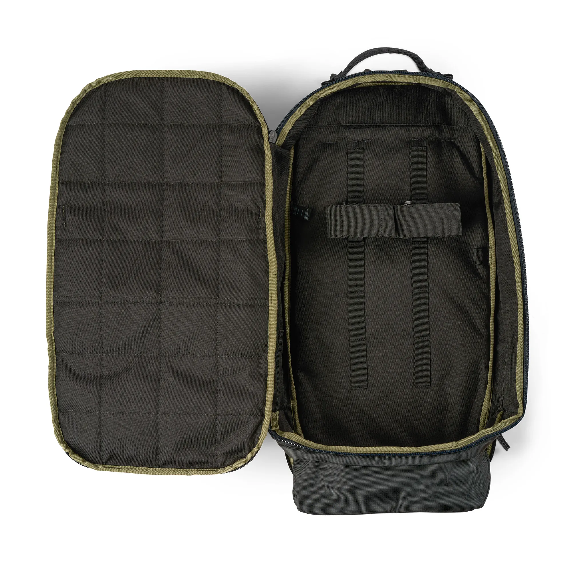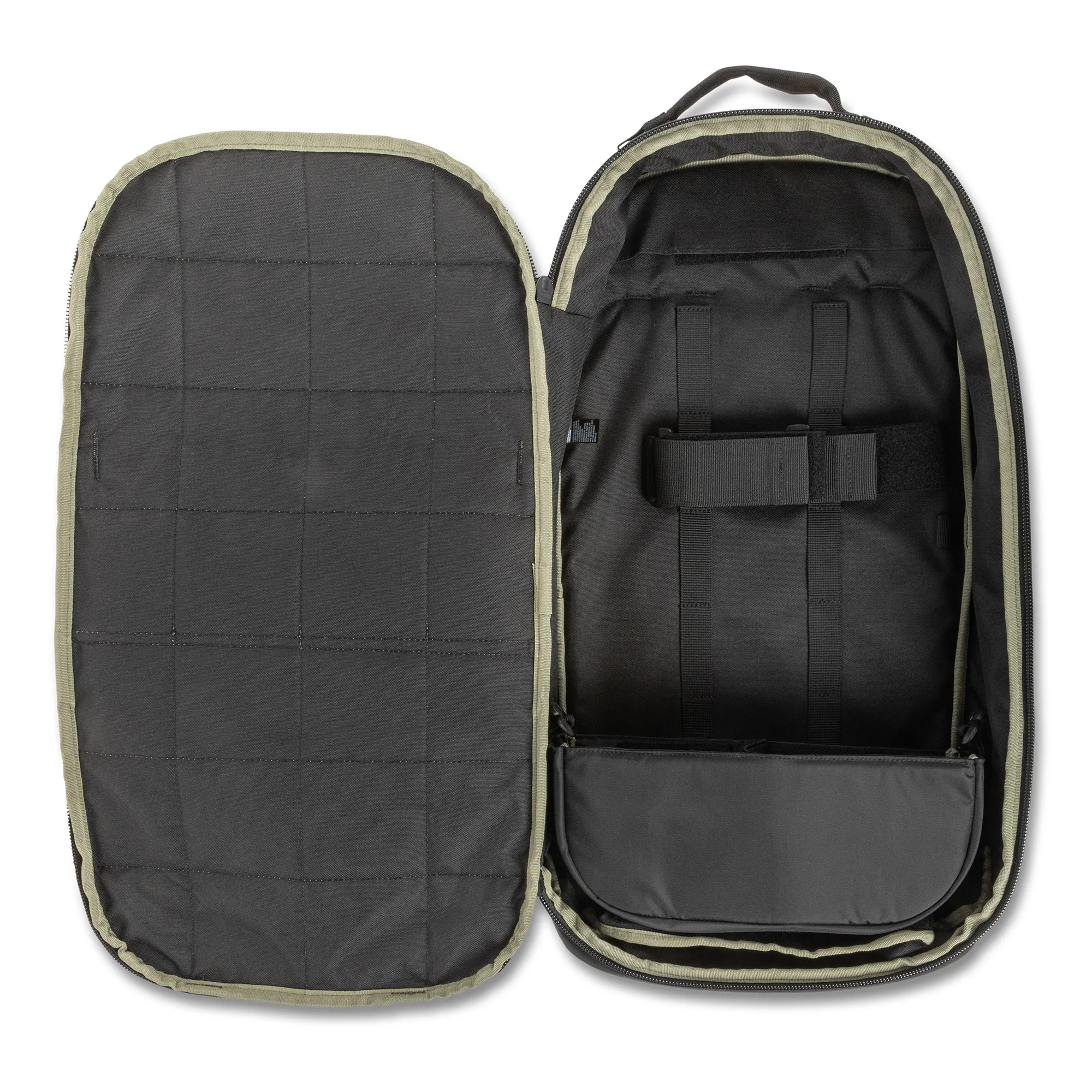 - Compartimento secundário para armas com bolso reforçado para cano com divisória ajustável, presilhas de teia e duas tiras de retenção para arma longa